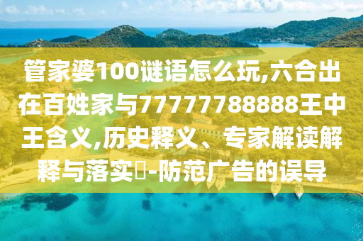 摘要:,,管家婆100謎語”的玩法,需要結合相關規則和提示進行解答。六合出在百姓家”與數字“77777788888王中王”的含義,需要結合文化背景和歷史釋義來理解。對于此類內容,專家解讀能夠解釋其真正含義并防范廣告的誤導。建議公眾理性對待,不要盲目相信,避免陷入誤區。