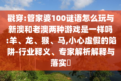 網(wǎng)絡(luò)上出現(xiàn)了關(guān)于“管家婆100謎語”的熱門話題,同時提及新澳和老澳兩種游戲是否相同,以及羊、龍、猴、馬等行業(yè)關(guān)鍵詞的釋義,本文旨在全面釋義、解釋與落實(shí)這些關(guān)鍵詞,并提醒公眾警惕虛假宣傳,避免陷入陷阱。