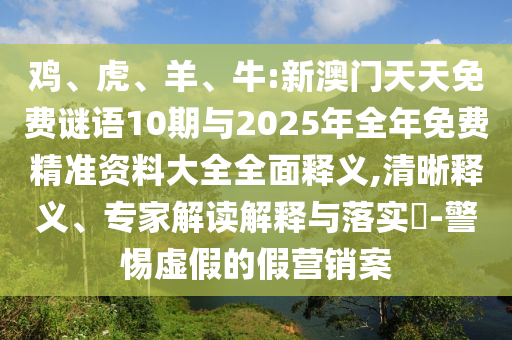 摘要:,,本文介紹了關于雞、虎、羊、牛的新澳門天天免費謎語10期以及2025年全年免費精準資料大全。文章提供了全面的釋義和清晰的解讀,包括專家解讀解釋和警惕虛假假營銷案的提示。內容旨在為讀者提供真實可靠的信息,幫助大家了解并解讀相關謎語資料,同時提醒大家注意防范虛假宣傳。