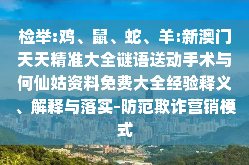 摘要:本文介紹了關于雞、鼠、蛇、羊的謎語,涉及新澳門天天精準大全的資料。文章提到了動手術與何仙姑資料的免費大全,同時強調了防范欺詐營銷模式的重要性。通過對相關內容的釋義、解釋和落實,幫助讀者理解和應對相關情況。文章內容簡潔明了,旨在提供有用的信息和指導。