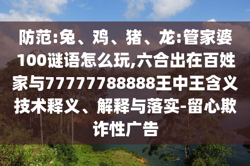 摘要:,,針對特定生肖如兔、雞、豬、龍的防范提醒,提到了管家婆100謎語的游戲玩法。涉及六合出在百姓家的概念與77777788888王中王的含義。提醒公眾留心欺詐性廣告,對技術釋義、解釋與落實進行關注。摘要簡短明了,提醒人們注意相關風險并加強防范意識。